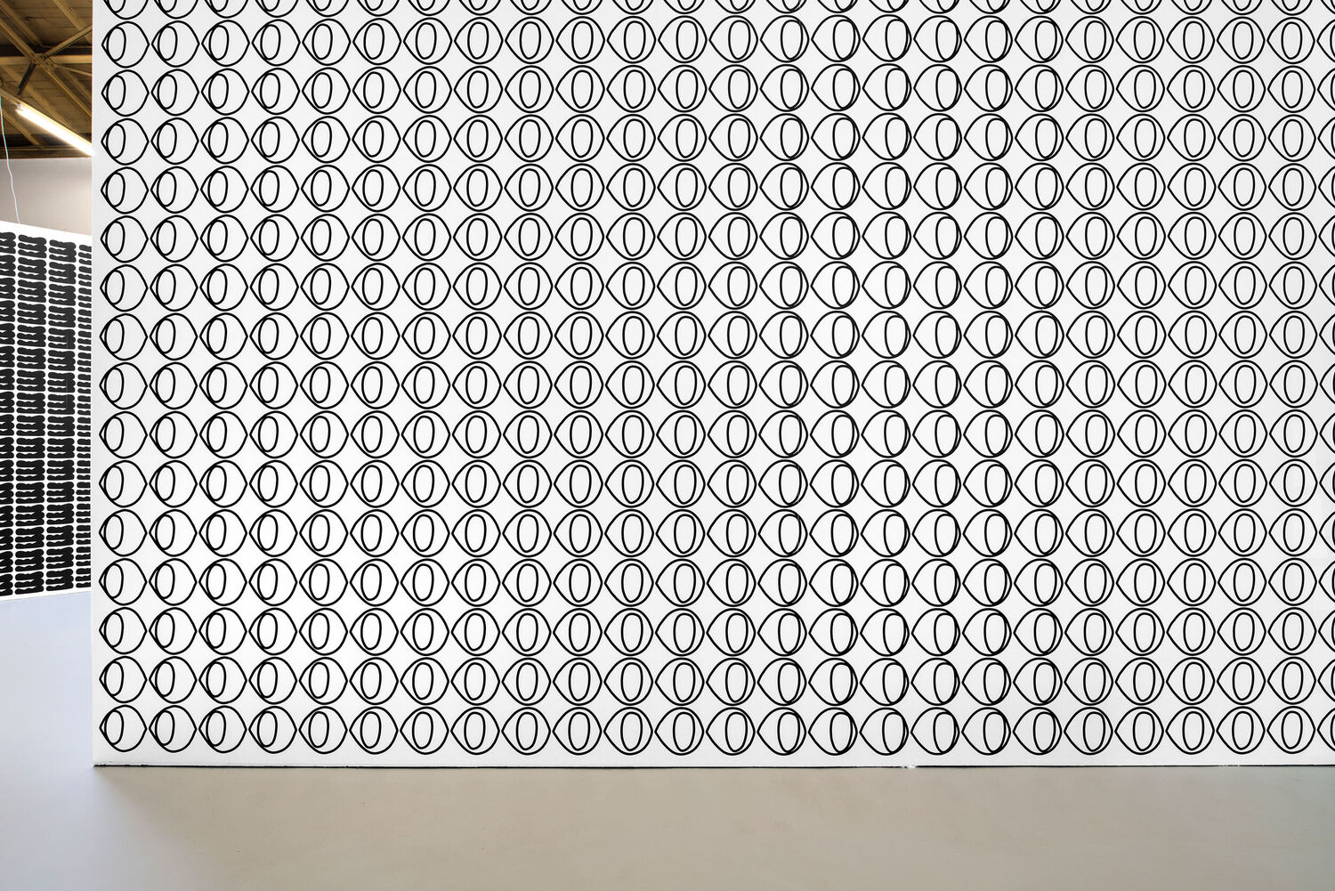 Die Tapeten selbst erstellt er mittels einer „Tapetenmaschine“, einem Algorithmus, der den Verlauf des Musters bestimmt, entweder linear oder per Zufall, indem festgelegte Elemente willkürlich aneinandergesetzt werden. Ähnlich wie in Muhrs Bleistiftzeichnungen, deren Struktur durch Auswürfeln (ganz analog per Hand) fortgeschrieben wird, kommt eine Komponente ins Spiel, die System und Zufall in Dialog treten lässt.