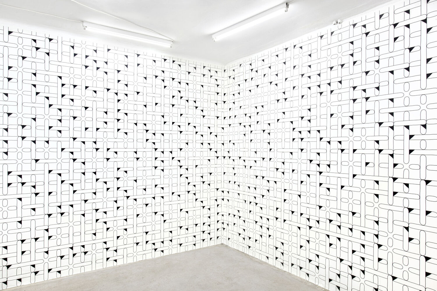 He creates the wallpapers himself using a “wallpaper machine, ” an algorithm that determines the course of the pattern, either linearly or randomly, by arbitrarily placing predetermined elements next to each other. Similar to Muhr's pencil drawings, whose structure is continued by rolling dice (completely analog by hand), a component comes into play that allows system and chance to enter into dialogue.