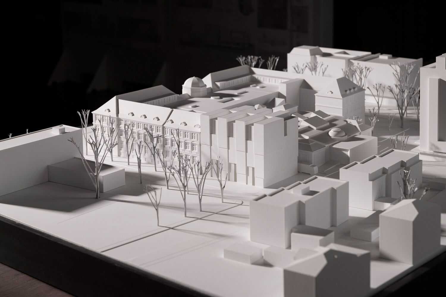 (oben) Modell des zukünftigen Erweiterungsbaus des Museums Wiesbaden. Copyright: Schenker Salvi Weber. Fotos: Museum Wiesbaden / Bernd Fickert