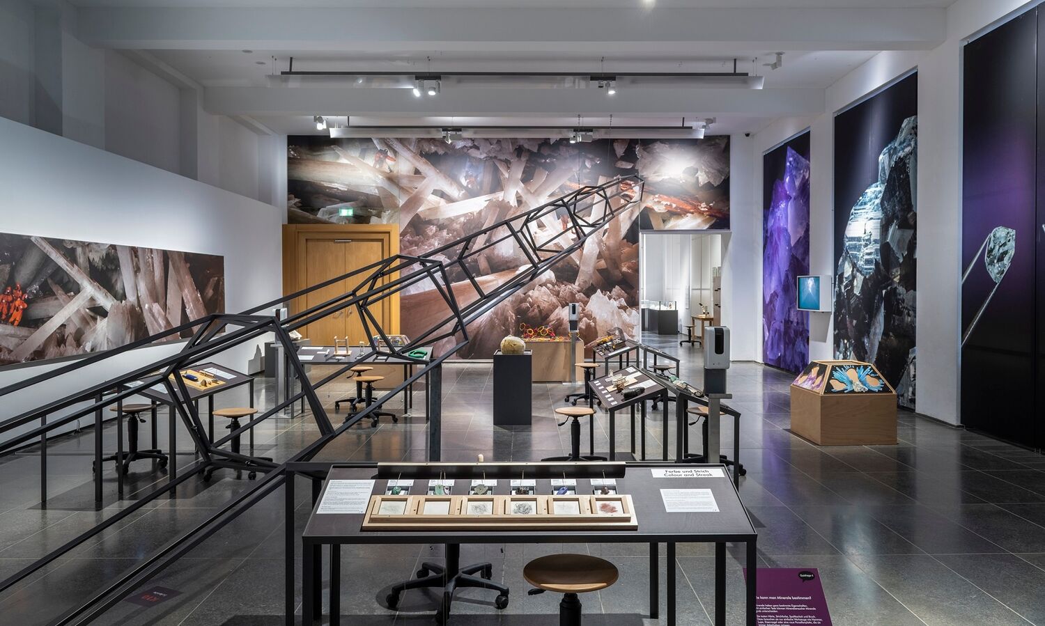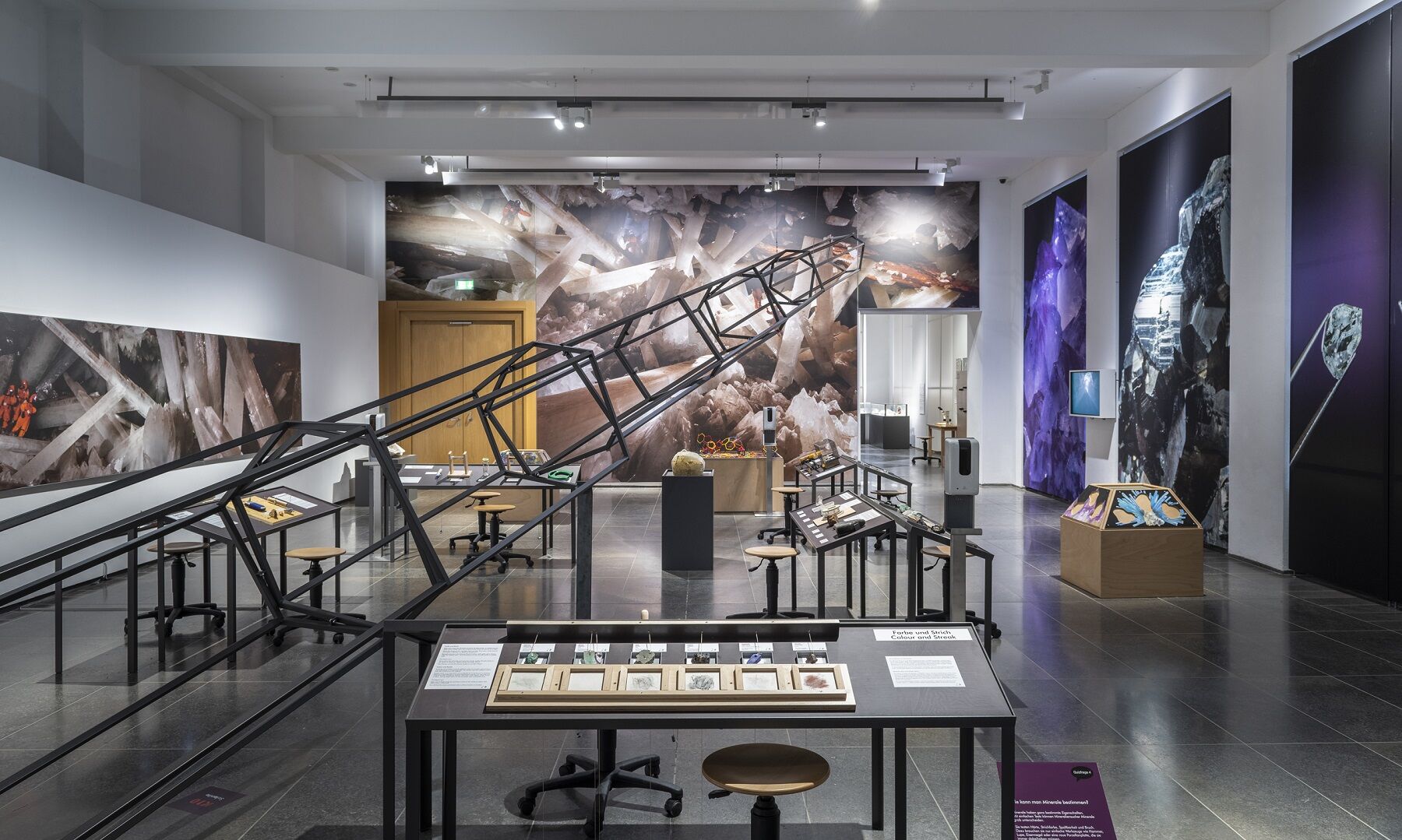 Blick in die Ausstellung "Kristalle – Vom Diamanten bis zum GIps". Foto: Museum Wiesbaden  / Bernd Fickert