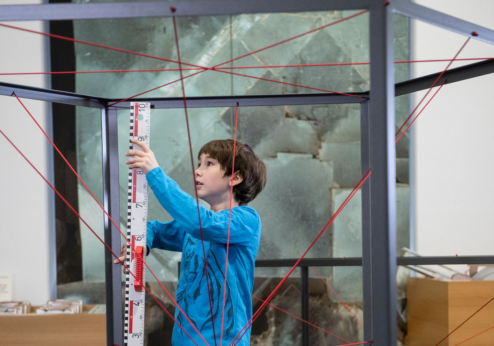 Junger Forscher beim Messen von Kristallmodellen. Foto: Museum Wiesbaden  / Bernd Fickert