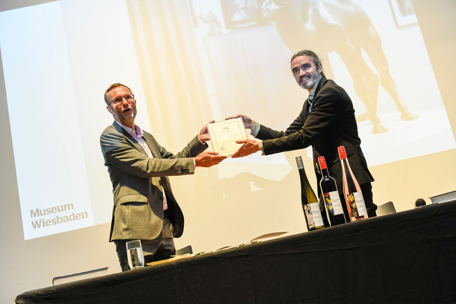 Dr. Andreas Henning und Dr. Roman Zieglgänsberger mit Jawlensky-Urkunde. Foto: Museum Wiesbaden  / Bernd Fickert