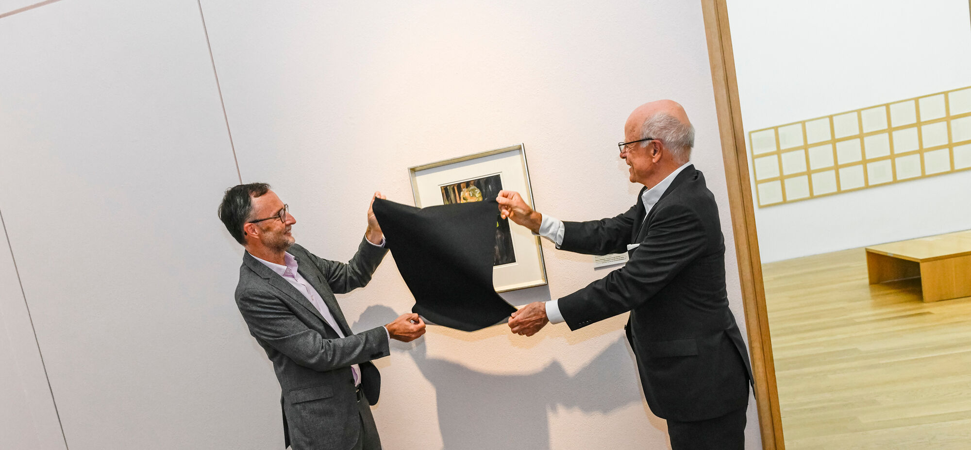Dr. Andreas Henning und Dr. Gerd Eckelmann bei der Enthüllung einer Schenkung. Foto: Museum Wiesbaden  / Bernd Fickert