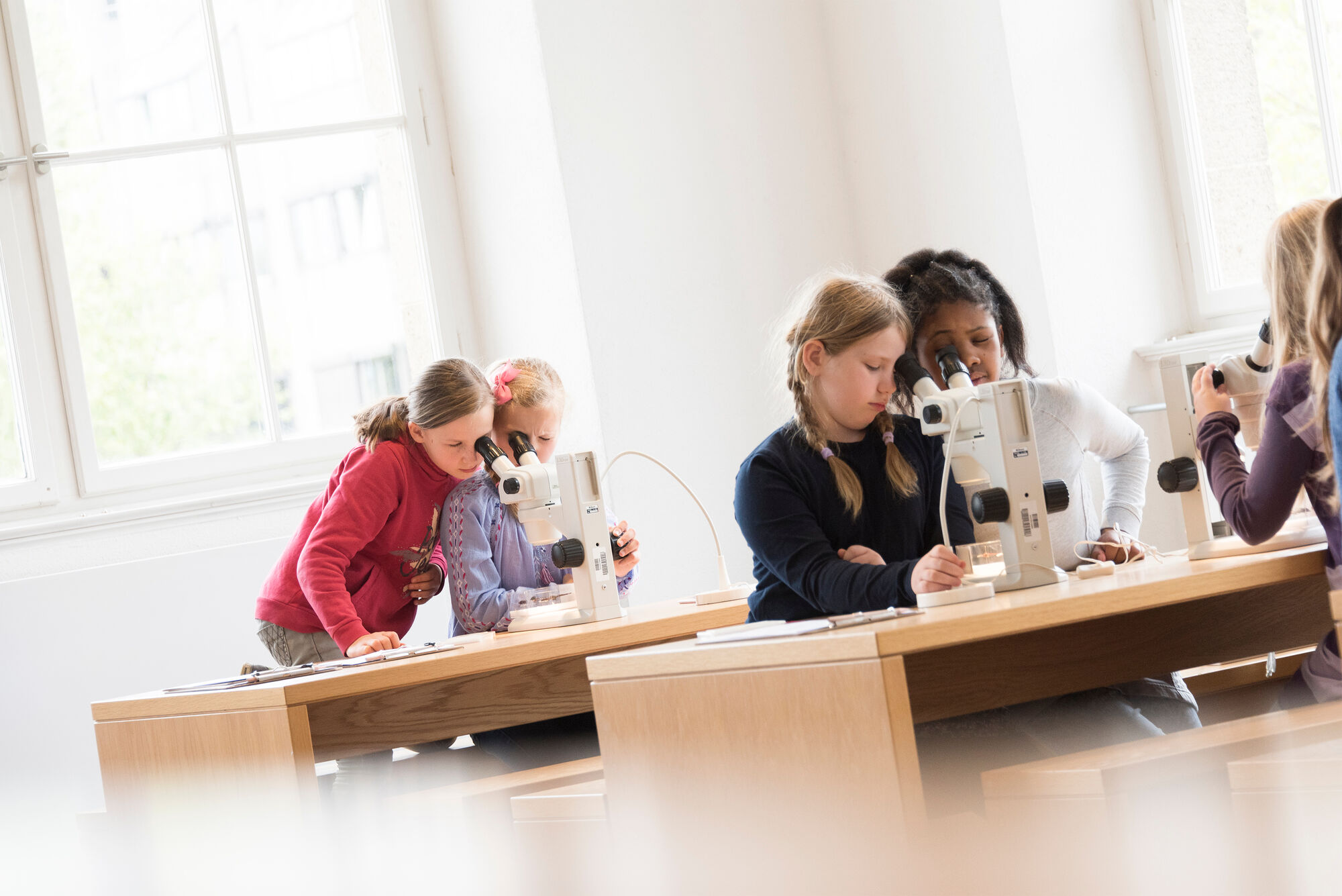 Schülerinnen beim Mikroskopieren. Foto: Museum Wiesbaden  / Bernd Fickert