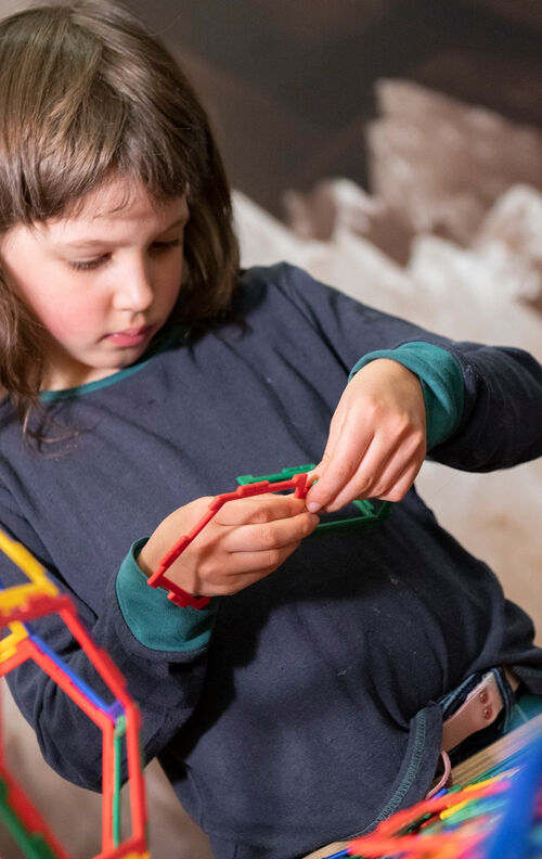 Junge Besucherin an einer Mitmachstation der Schau "Kristalle. Vom Diamanten bis zum Gips". Foto: Museum Wiesbaden  / Bernd Fickert