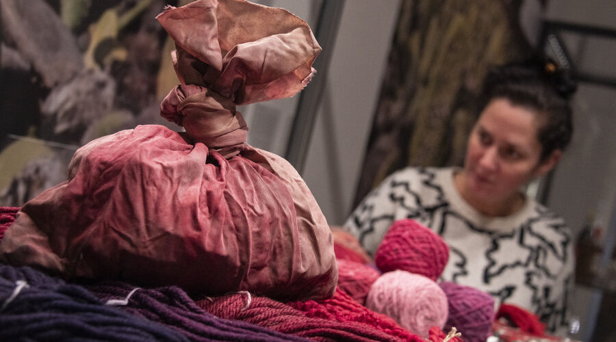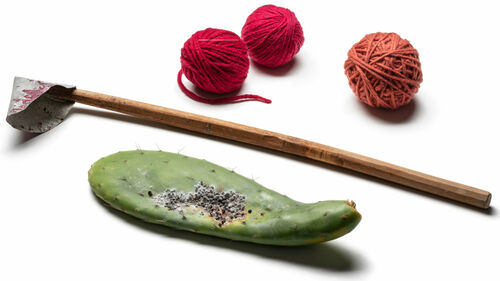 Mit Cochenille gefärbte Wolle, Erntelöffel und Cochenilleläusen auf Opuntienblatt. Foto: Museum Wiesbaden / Bernd Fickert