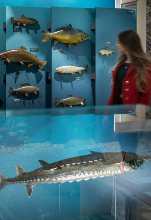 Rhein-Diorama in der Ausstellung mit junger Forscherin. Foto: Museum Wiesbaden / Bernd Fickert.