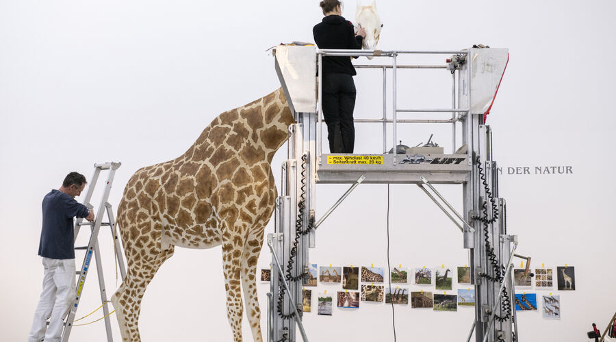 Aufbau des Giraffenmodells. Foto: Museum Wiesbaden / Bernd Fickert