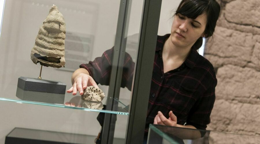 Kuratorin Lisa Schwarz beim Positionieren der Objekte der Ausstellung "Leben aus Lehm". Foto: Museum Wiesbaden / Bernd Fickert