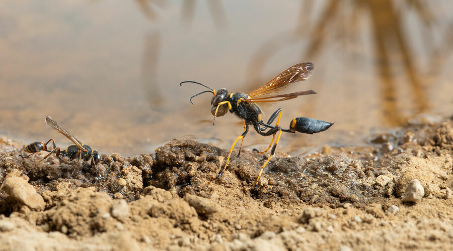 Wespen beim Sammeln von Lehm (von links: Sceliphron curvatum, Sceliphrom caementarium). Foto: Museum Wiesbaden / Bernd Fickert