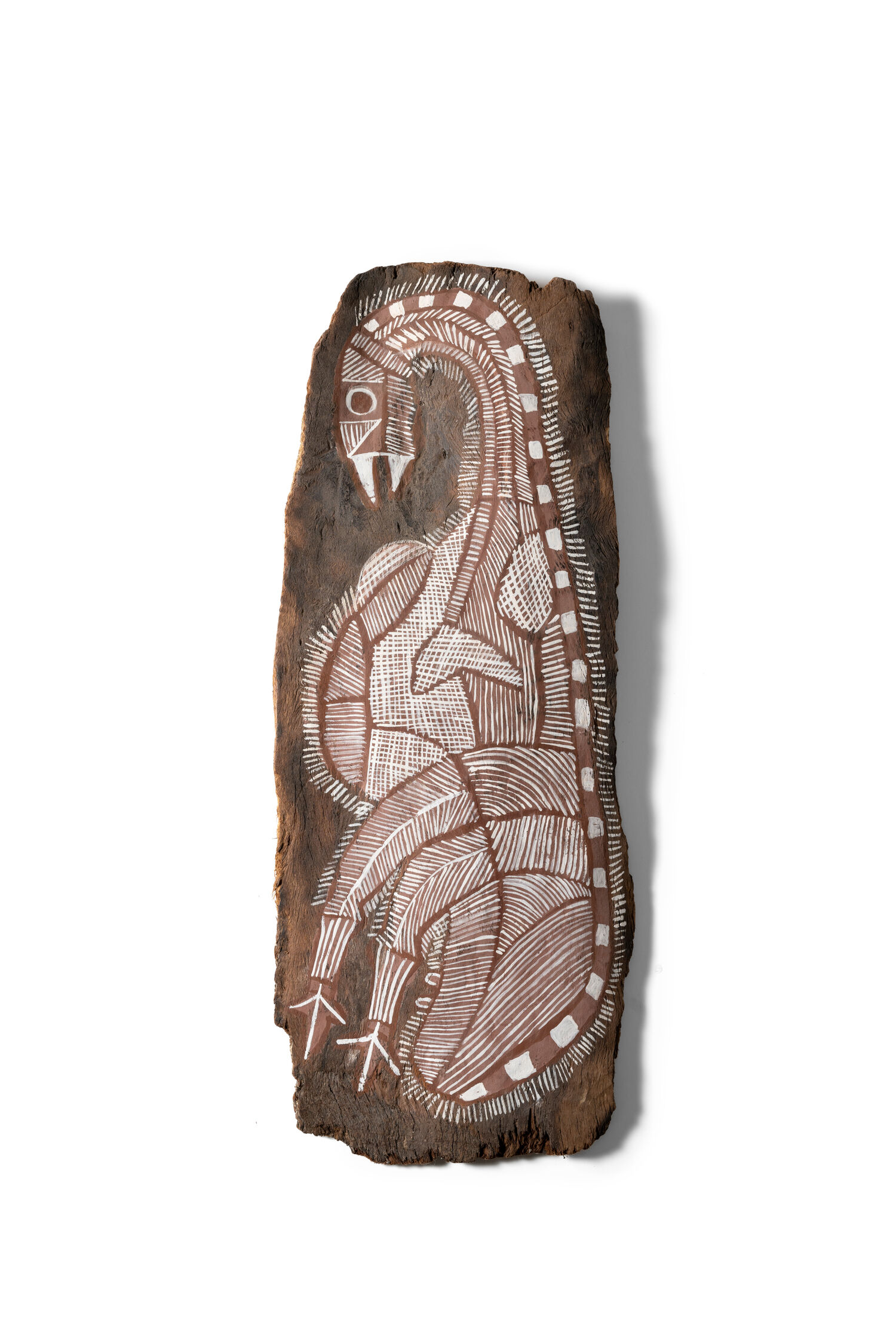 Diese bemalte Rinde eines Eukalyptus-Baumes ist typisch in West-Arnheimland im Norden Australiens. Man bezeichnet sie als Röntgenstil und hier zeigt sie einen Emu mit Teilen seiner Anatomie. Die Rindenmalerei dieser Region hat ihre Grundlage deutlich in den Felsmalereien. Das Motiv ist wohl das älteste weltweit, findet es sich seit mindestens 10.000 Jahren und in Australien nutzen es noch immer aktuelle Künstlerinnen und Künstler. Der Erwerb fand über Herrn Werner Hammer statt. Bereits 2013 spendete Frau Karin Müller ein ähnliches Bild, das ein Wallaby zeigt.
