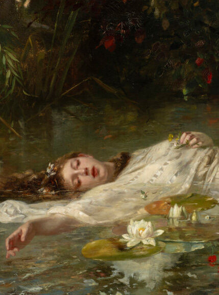 Die Szene stammt aus William Shakespeares Hamlet und wurde 1852 vom englischen Maler John Everett Millais, einem Vertreter der sogenannten Präraffaeliten – einer Künstlergruppe, die sich an der Kunst vor Raphael orientierte – berühmt umgesetzt. Seine „Ophelia“ gilt als die wohl bekannteste Darstellung dieses Motivs.